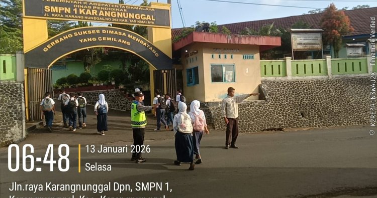 Karangnunggal – Anggota Polsek Karangnunggal melaksanakan pengaturan lalu lintas sekaligus bantu pelajar menyeberang jalan di depan SMPN 1 Karangnunggal Kecamatan Karangnunggal Kabupaten Tasikmalaya, Selasa (13/1/26).