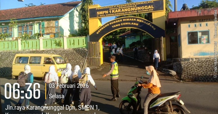 Karangnunggal – Anggota Polsek Karangnunggal melaksanakan pengaturan lalu lintas sekaligus bantu pelajar menyeberang jalan di depan SMPN 1 Karangnunggal Kecamatan Karangnunggal Kabupaten Tasikmalaya, Selasa (3/2/26).