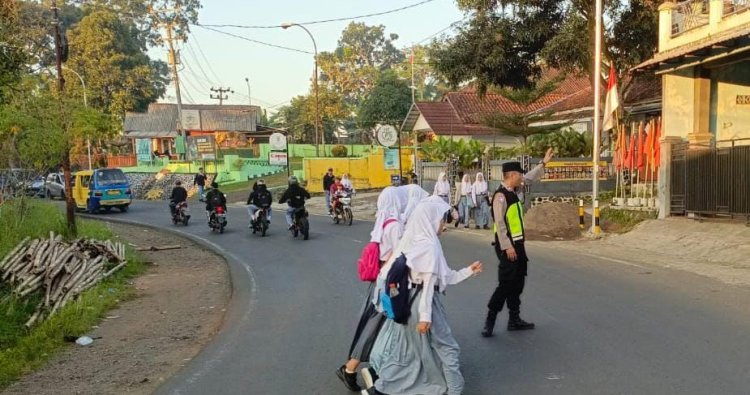 Seperti pengaturan di Depan SMAN 1 Karangnunggal, personil Polsek Karangnunggal melaksanakan pengaturan dan membantu pelajar sekolah dalam hal menyeberang jalan.