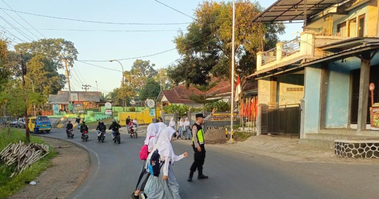 Seperti pengaturan di Depan SMAN 1 Karangnunggal, personil Polsek Karangnunggal melaksanakan pengaturan dan membantu pelajar sekolah dalam hal menyeberang jalan.